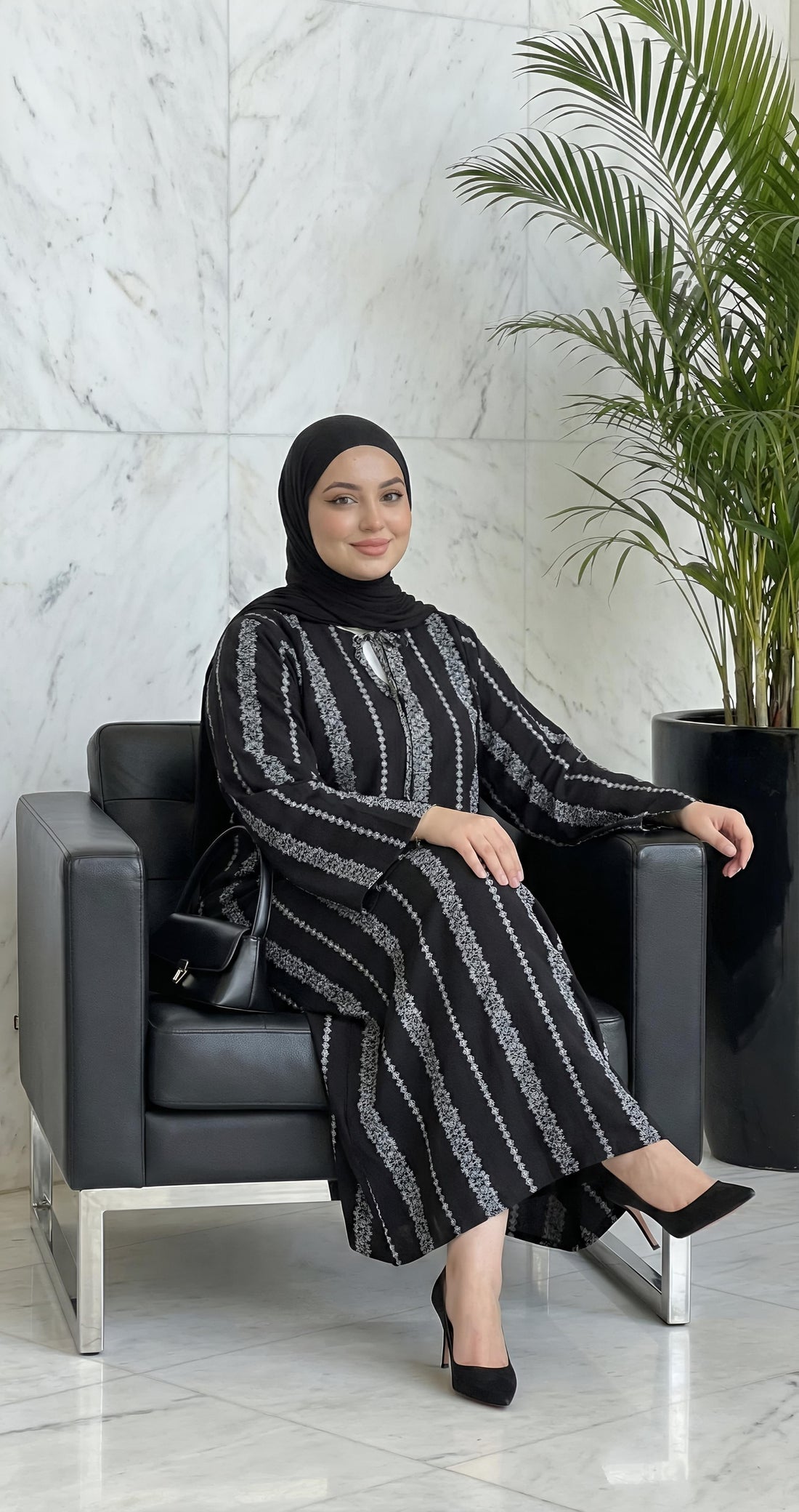 A graceful black kaftan dress featuring elegant vertical printed detailing that creates a flattering, elongated...