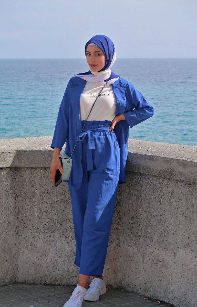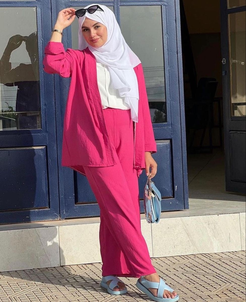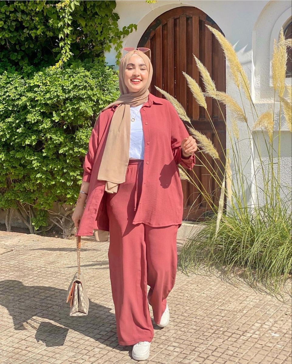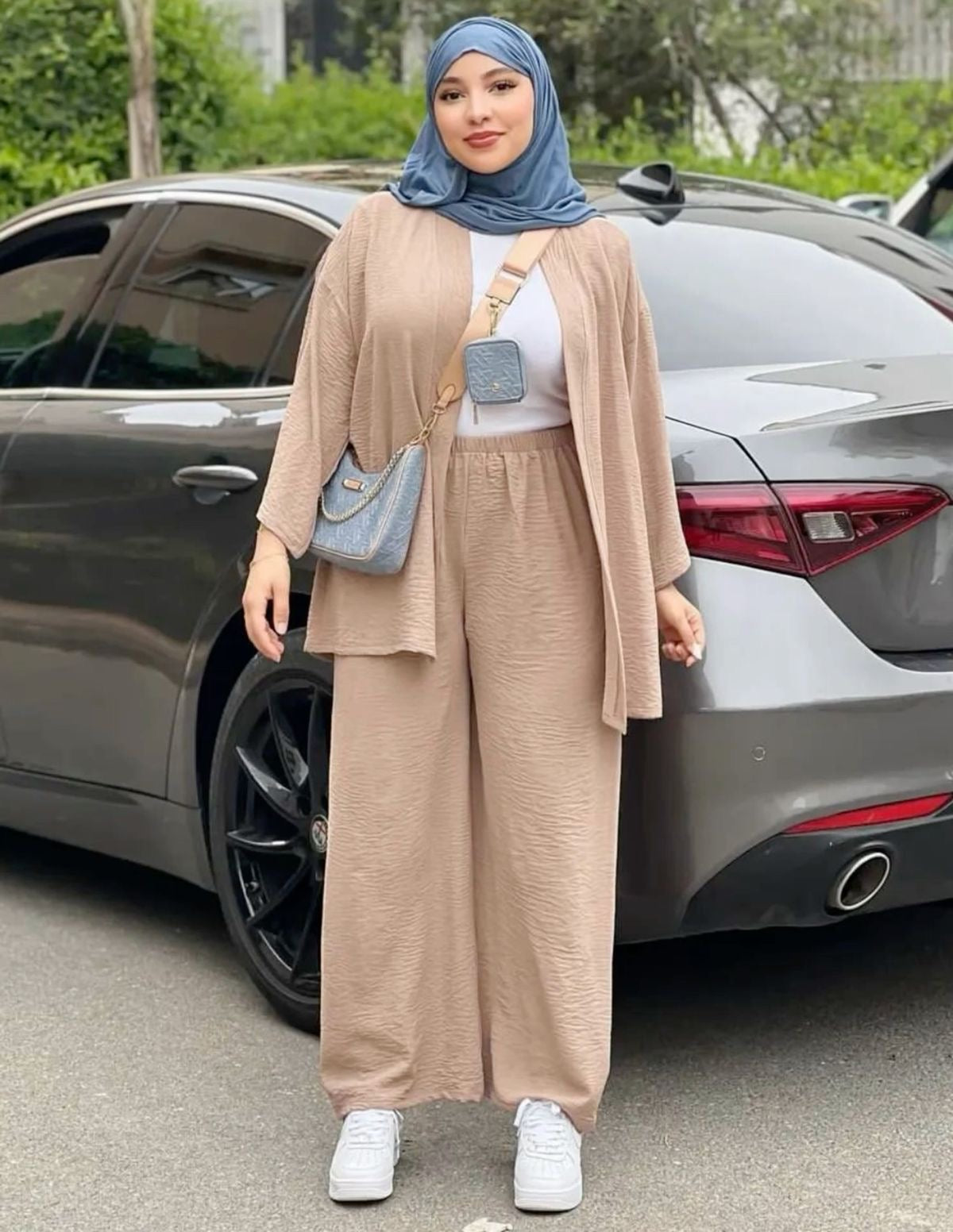 Step into effortless elegance with this three-piece terracotta co-ord set featuring wide-leg pants, a relaxed-fit shirt, and a white inner tee. Crafted from lightweight, breathable fabric, this ensemble offers ultimate comfort and a modest, chic aesthetic. The earthy tone exudes warmth, while the matching shirt and pants provide a seamless silhouette. Styled with a nude hijab and white sneakers, this look is perfect for sunny outings, casual brunches, or everyday wear.